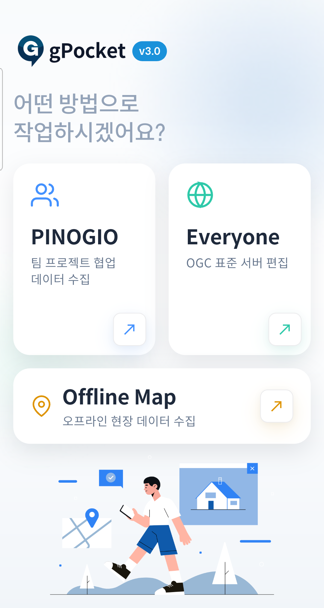 gPocket은 iOS와 Android를 모두 지원하는 모바일 공간 데이터 수집 앱입니다. 아래 3가지 수집 모드 중 목적에 맞는 모드를 선택하여 사용합니다.